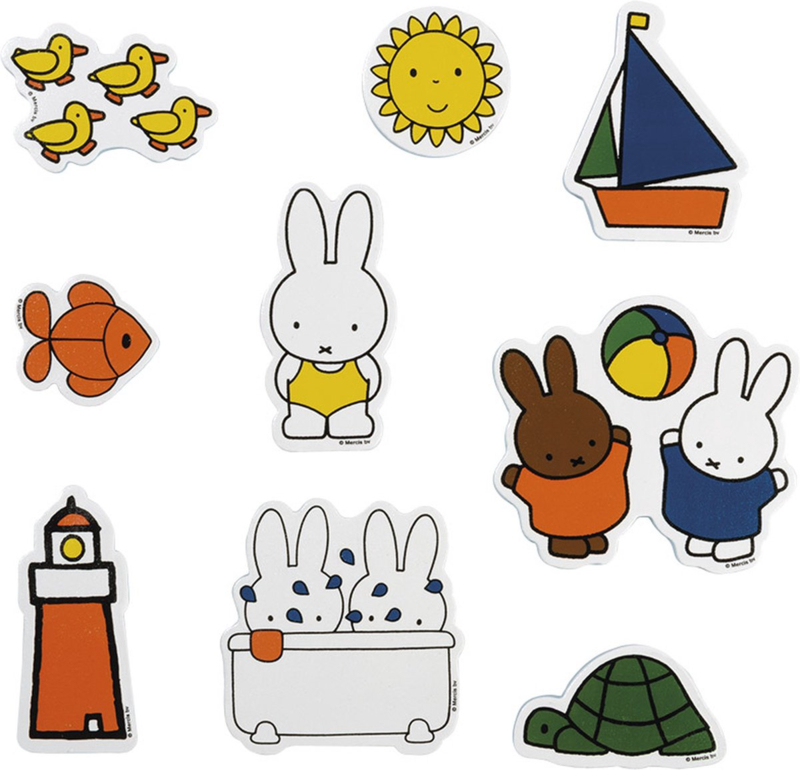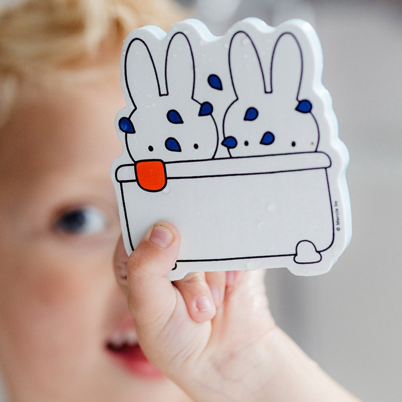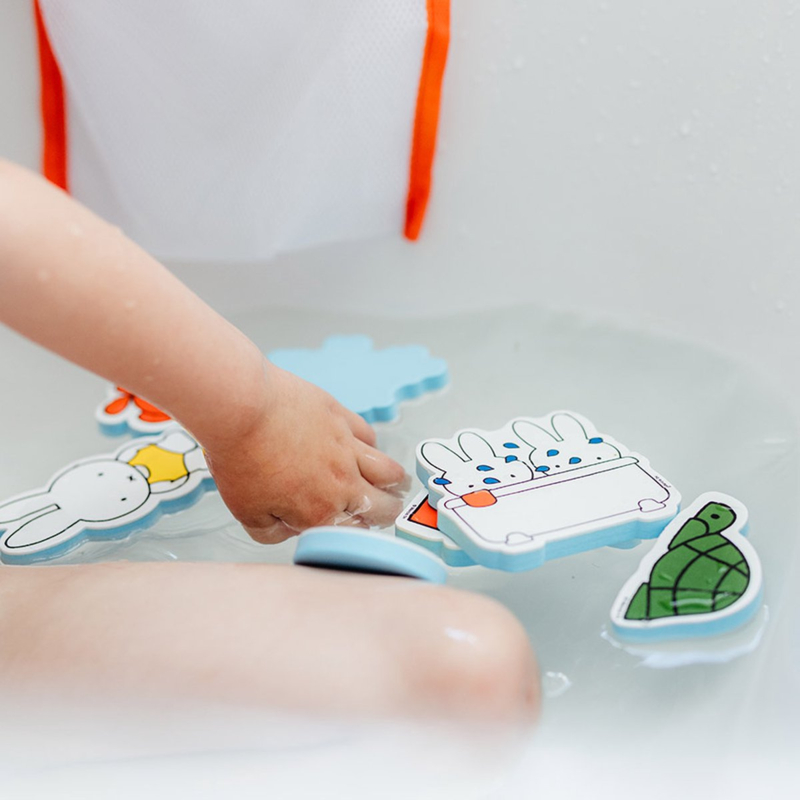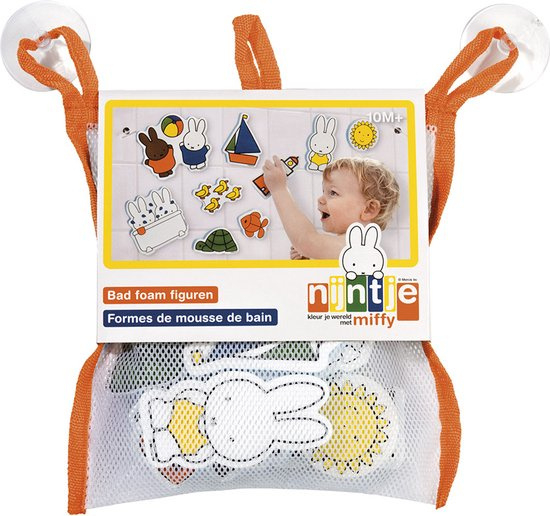Deze set bestaat uit 9 foamvormen voor in bad of onder de douche met daarop illustraties van Nijntje en haar vriendjes. De vormen blijven vanzelf aan gladde opvlakten plakken wanneer ze nat zijn. Berg na het spelen de vormen netjes op in het bijgeleverde, waterbestendige opbergnetje om ze opnieuw en opnieuw te gebruiken.